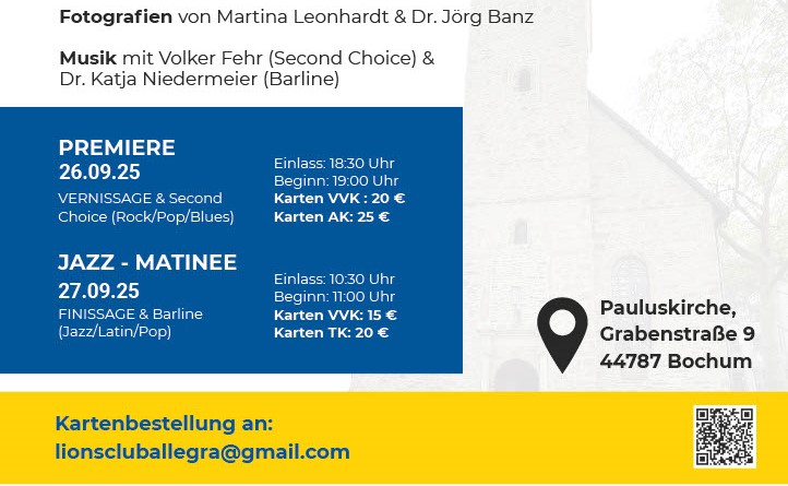 Karten für beide Veranstaltungen einfach per Mail bestellen: lionscluballegra@gmail.com